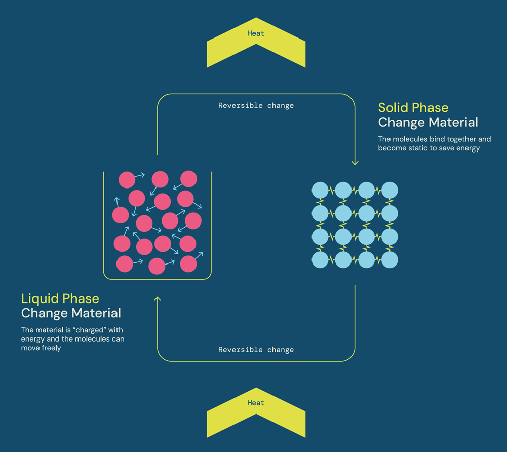 Figurtekst: Viser faseovergangen mellom fast stoff, væske og tilbake igjen for PCM, en helt reversibel prosess. Kilde: Cartesian AS.
