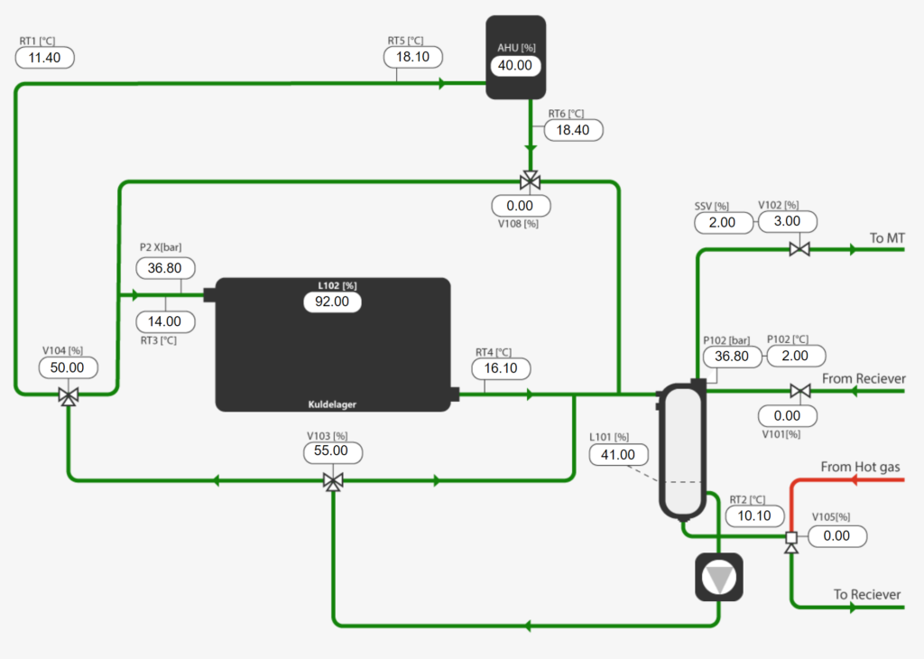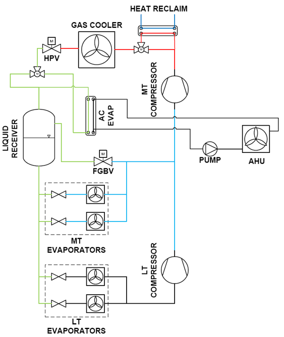 Anlegget som er utgangspunktet for pilot kuldelagring er et standard transkritisk boosteranlegg, som inkluderer integrasjon av klimakjøling og varmegjenvinning. Et forenklet flytskjema for referanseanlegget er presentert i figuren nedenfor. Her vises fryse- og kjølekompressorene (LT og MT) som ligger i boosterkonfigurasjon, med varmeveksler for varmegjenvinning til ventilasjon via en varmtvannskrets. Videre etter gasskjøleren og høytrykksventilen finner vi løsningen for klimakjøling på dette anlegget. Det består av en varmeveksler med en 3-veis ventil nedstrøms for høytrykksventilen (HPV) på CO2-siden som kjøler ned en pumpesirkulert glykolsløyfe.