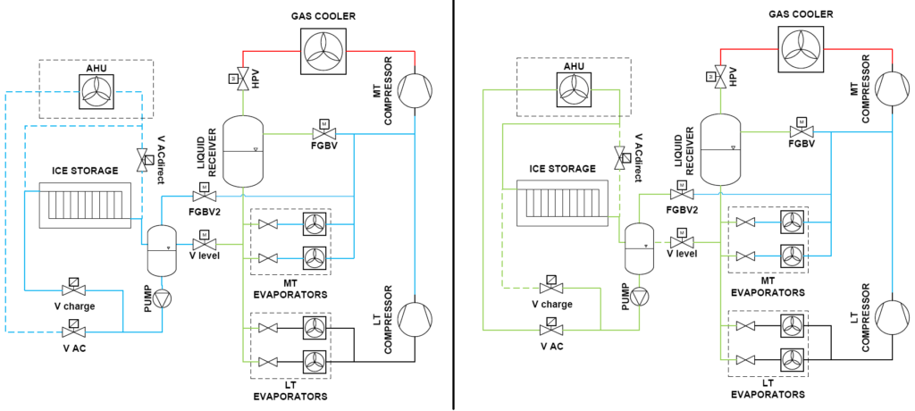 Figuren nedenfor viser det konseptuelle oppsettet for kuldeanlegget som har integrert i oppladingsmodus (venstre) og utladingsmodus (høyre). De heltrukne linjene viser hvilke deler som er aktive i de ulike modusene, og de stiplede linjene indikere hvilke som er inaktive. Resten av CO2-anlegget har ikke blitt endret, bortsett fra at glykolsløyfen for klimakjøling er utkoblet. Tilleggssystemet for kuldelagring består av en pumpesirkulert CO2-krets med egen væskebeholder og nytt ventilasjonsbatteri for CO2, slik at denne kretsen kan driftes uavhengig av hovedanlegget. Neste figur viser mer detaljer rundt tilleggsanlegg for kuldelagring som ble tilkoblet hovedanlegget. Kuldelagringsanlegget kan driftes fire ulike modus: