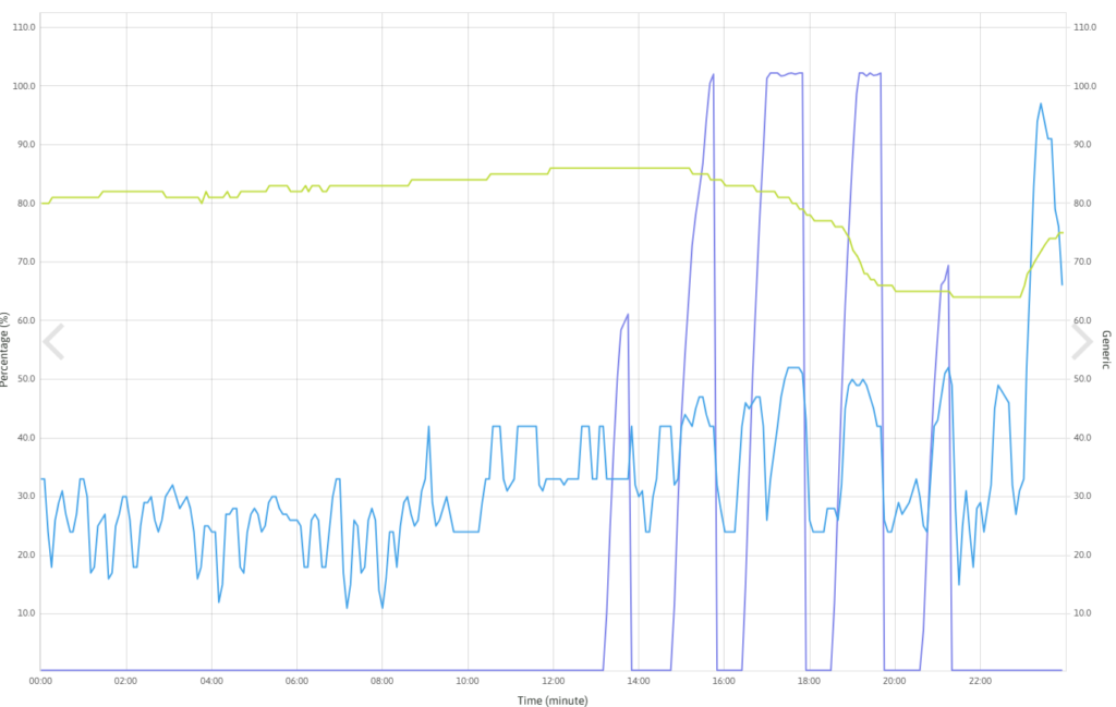 Figur: Driftskurve for kuldelager en varm dag. Blå: pådrag kjølekompressortrinn, lilla: behov klimakjøling, grønn: ladningsstatus kuldelager.