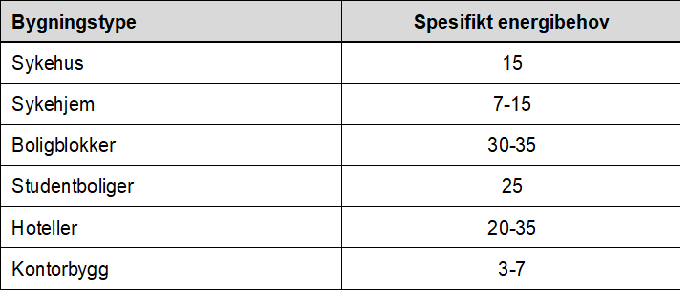 Årlig energibehov til varmtvannsberedning og tilhørende midlere effektbehov må baseres på måledata for aktuell bygningskategori. Tabellen viser eksempler på målt spesifikt årlig energibehov (kWh/år) for varmtvannsberedning for et utvalg bygningstyper fra VarmtVann2030 og Masteroppgaver ved NTNU.