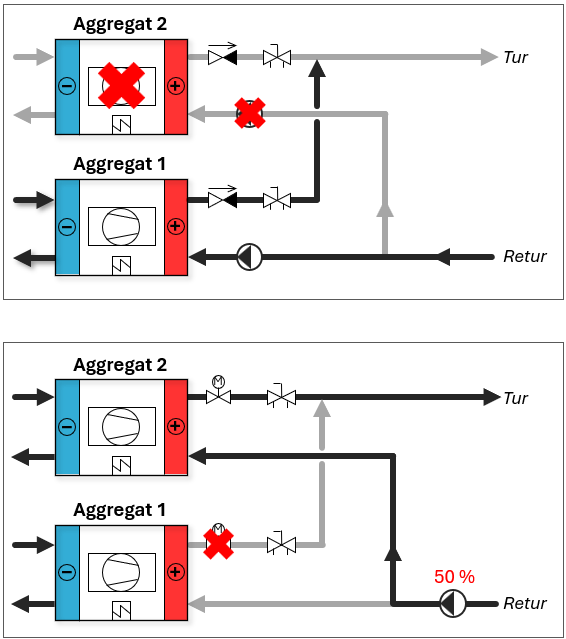 I et anlegg med for eksempel to aggregater med parallellkoblede kondensatorer er det viktig å forhindre vannstrøm gjennom kondensatoren i det aggregatet som eventuelt er avslått. Dersom oppvarmet vann fra det aktive aggregatet blandes med uoppvarmet vann fra det inaktive, må temperaturen på det oppvarmede vannet økes for at blandingstemperaturen skal nå settpunktet. Dette fører til redusert (COP for aggregatet som leverer varme.