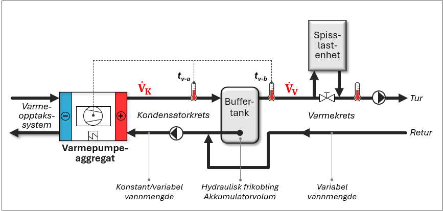 For å sikre ønsket funksjon og oppnå høyest mulig SCOP for varmepumpeanlegget, må vannmengden i Kondensatorkrets (Vk) til enhver tid være lik eller større enn vannmengden i Varmekrets (Vv). Når vannmengdene er like, vil hele vannmengden fra Varmekrets sirkulere gjennom kondensatoren(e) og varmes opp til ønsket temperatur. Dersom vannmengden i Kondensatorkrets er større enn i Varmekrets, vil overskytende vann fra turledningen strømme ned gjennom buffertanken og blande seg med returvannet fra Varmekrets. Dette gir en noe høyere returtemperatur for varmepumpen, men påvirker COP i liten grad.