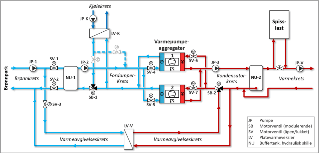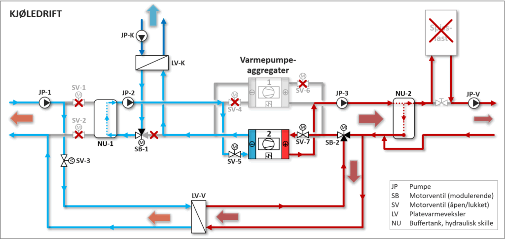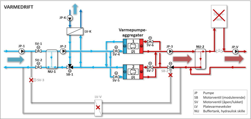 I «Varmedrift» reguleres varmepumpeanleggets varmeytelse ut fra utetemperatur-kompensert turtemperatur i Varmekrets. 3-veis reguleringsventil SB-1, alternativt en egen pumpe, regulerer for å oppnå settpunkt-temperatur i Kjølekrets. Hvis ventil SB-1 er fullt åpen og det ikke oppnås settpunkt-temperatur i Kjølekrets, er frostvæsketemperaturen for høy til å dekke kjølebehovet. Anlegget kobles da over til «Kjøledrift» ved at motorventil SV-3 i Dumpekrets åpner og SV-1 og SV-2 i Brønnkrets stenger. Varmepumpeanleggets ytelse (kompressorpådrag) reguleres nå for å oppnå settpunkt-temperatur i Kjølekrets. Varme som ikke benyttes i bygget (overskuddsvarme) avgis til brønnparken via Varmeavgivelseskrets. 3-veis reguleringsventil SB-2 reguler vannmengden mot varmeveksler LV-V slik at det oppnås en gitt returtemperatur til varmepumpen, f.eks. 30 °C, alternativt en gitt turtemperatur i Varmekrets.