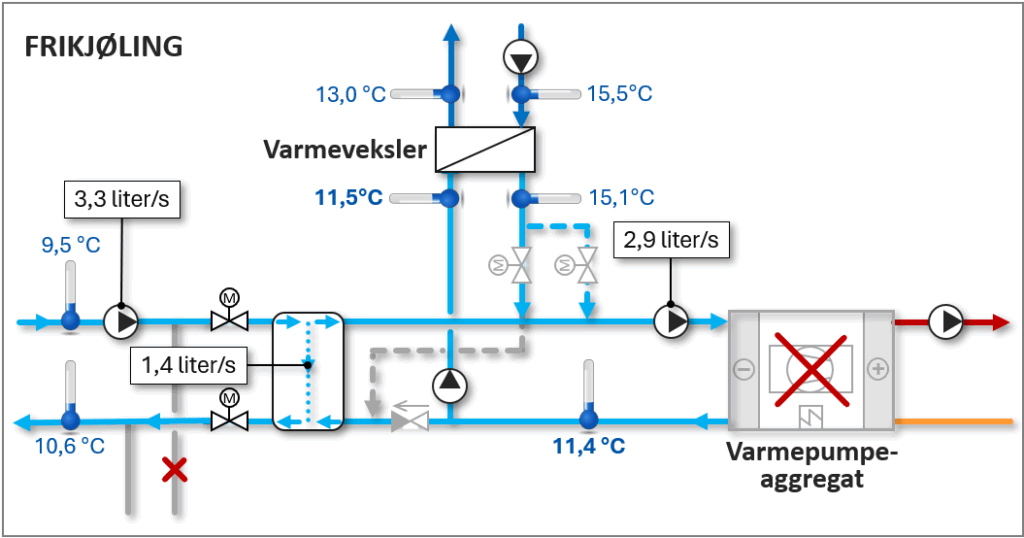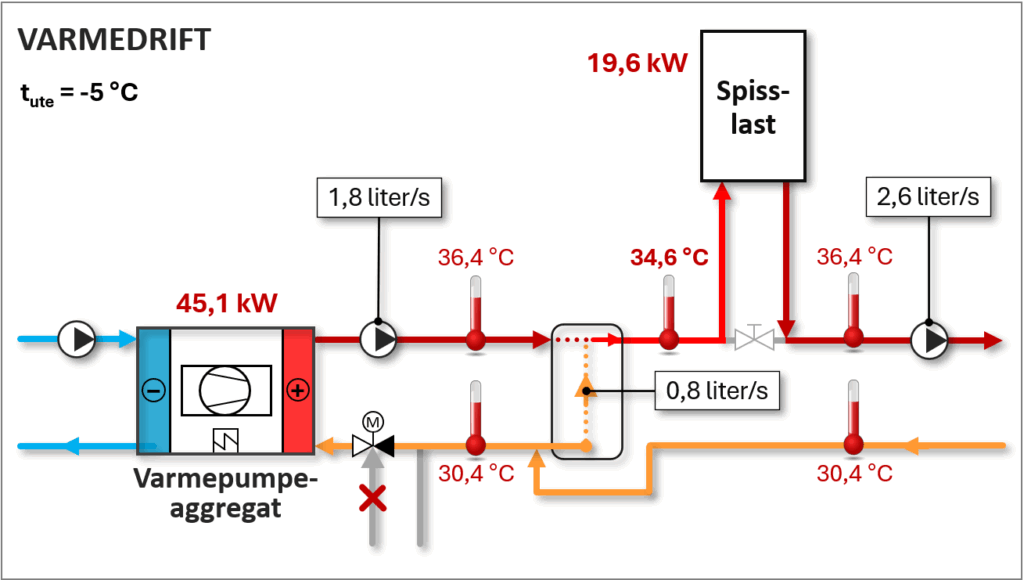 I «Varmedrift» reguleres kompressorene i varmepumpeaggregatene slik at utgående vanntemperatur til-svarer utetemperatur-kompensert turtemperatur. Når rådgivere utarbeider systemskjema for varmepumpe-anlegg, oppgis det alltid brutto effektbehov, vannmengde og tur-/returtemperatur ved dimensjonerende utetemperatur (DUT) for varmeavgivere og røranlegg i varmesystemet. Brutto effektbehov inkluderer imidlertid ikke interne varmelaster i bygget, som personer, belysning og elektrisk utstyr, eller eventuelt soltilskudd. Dette innebærer at maks. vannmengde under drift typisk vil utgjøre 65–90 % av bruttonivå, avhengig av bygningstype, teknisk forskriftsnivå (TEK) og klimasone.