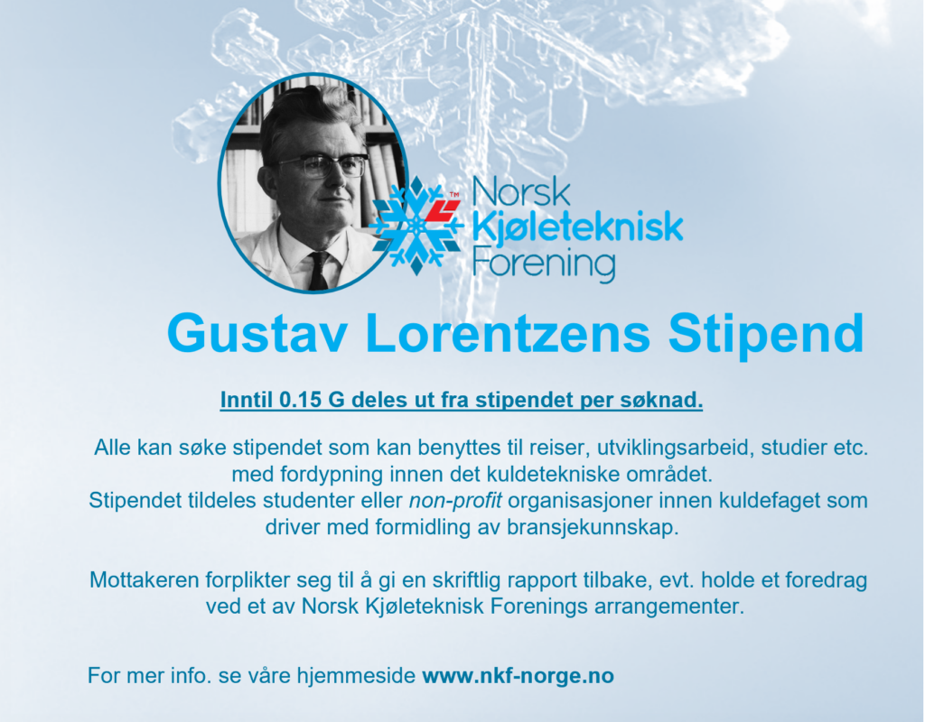 Gustav Lorentzens stipend tildeles medlemmer etter skriftlig begrunnet søknad til Norsk Kjøleteknisk Forening, og kan benyttes til reiser, utviklingsarbeid, studier etc. med fordypning innen det kuldetekniske området. Stipendet tildeles studenter eller non-profit organisasjoner innen kuldefaget som driver med formidling av bransjekunnskap. Stipendet skal ikke brukes til ordinær studiefinansiering ved skoler/universitet.